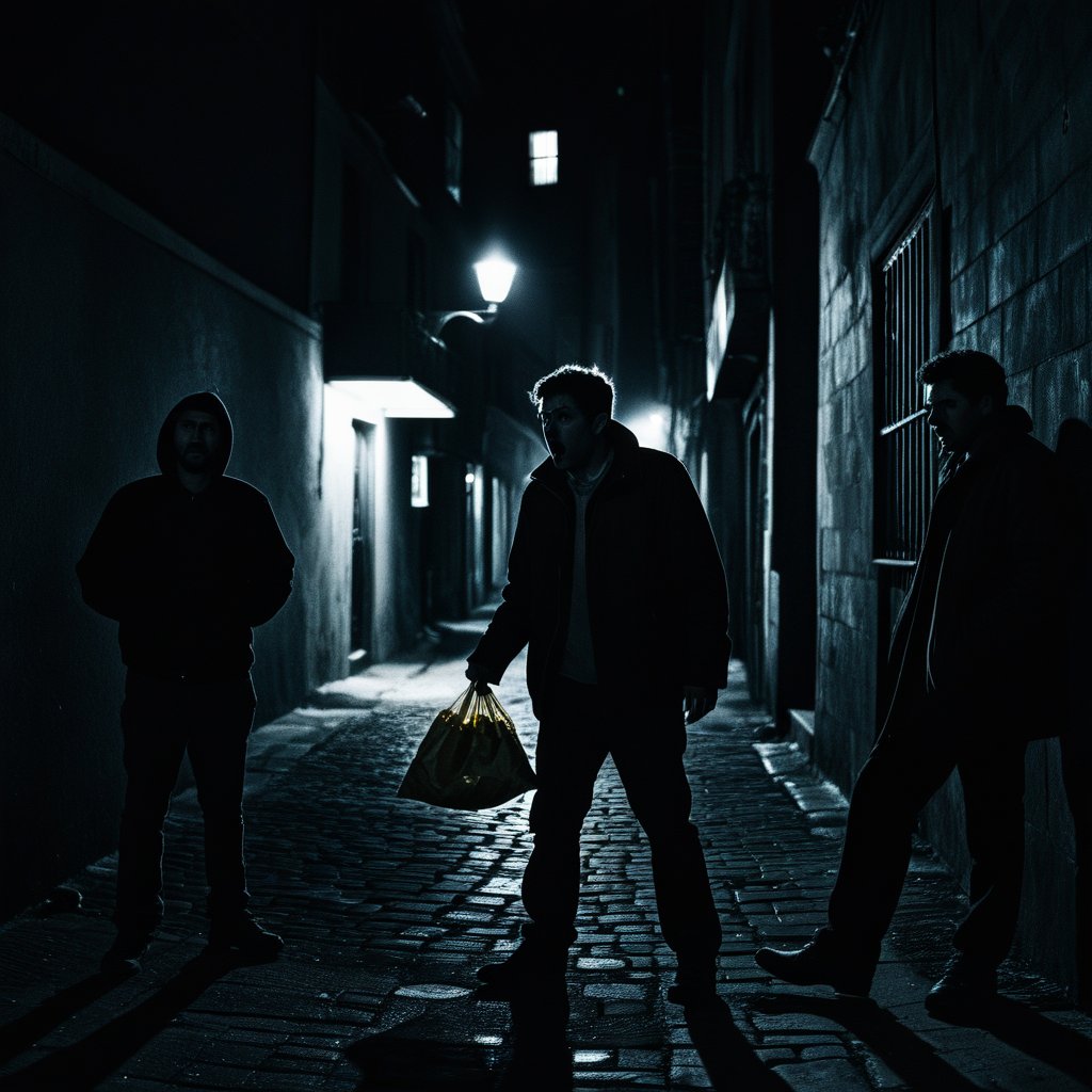 The dark city is your inner landscape of social complexity and overwhelm. The woman with you and the bag of chips you shared represent a part of your life where you find connection and nourishment. The three men are the ancient, familiar shape of your anxieties, now catching up to you in this current chapter of your life. Your first instinct was to offer your own nourishment to placate them, a profound act of self-sacrifice to avoid conflict. When that failed and they attacked what you care for (the woman), your power awoke—you knew you could destroy them. But you chose not to. You stopped. You issued a warning.