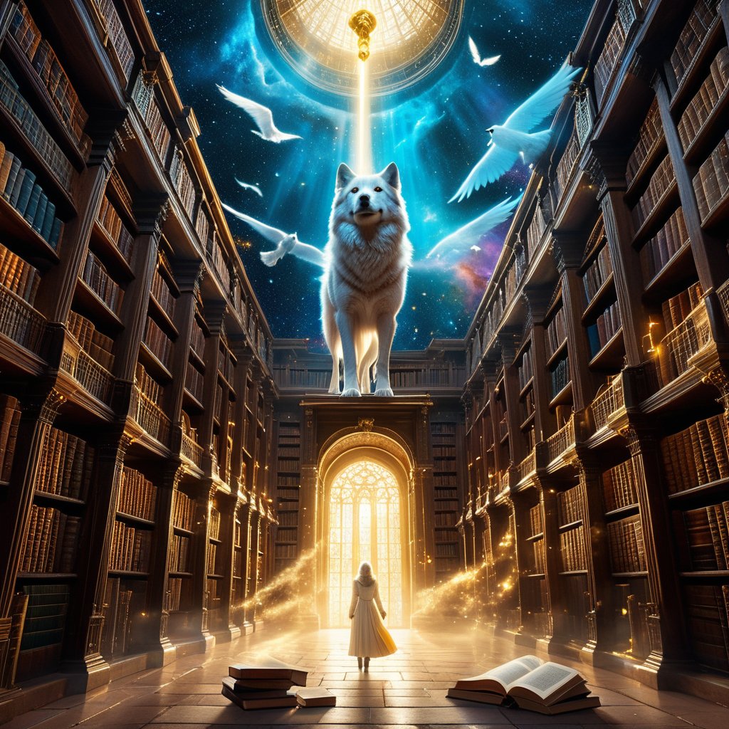 "I walked through an ancient library with a nebula above. Books flew like birds. One became a golden key. A white wolf told me to turn back."